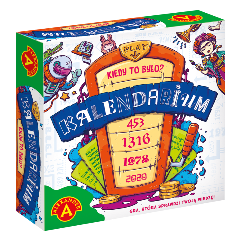 Są daty, które zna niemal każdy z nas. Chrzest Polski, Bitwa pod Grunwaldem, wybuch I Wojny Światowej – możemy je podać nawet wyrwani ze snu w środku nocy. Ale czy wiecie, w którym roku premierę miała kultowa gra „Doom”? A kiedy ukazał się na rynku pierwszy komiks z serii o Tytusie, Romku i Atomku? „Kalendarium” to świetny quiz, który nie tylko sprawdza waszą wiedzę historyczną, ale także pozwala wykazać się znajomością niezwykle różnorodnych dziedzin. To także lekcja przewidywania, bo aby zdobyć punkty nie trzeba znać dokładnej daty, lecz potrafić określić, która z odpowiedzi jest najbliższa prawdzie. Zwycięzcą zostanie osoba, która ma świetną pamięć do dat, a także potrafi odważnie obstawiać, gdyż to każdy gracz decyduje ile pchełek postawi na daną odpowiedź – 1, 2, czy 3. Fajna gra, która pozwoli bawić się długie godziny. Dla 3-6 graczy.