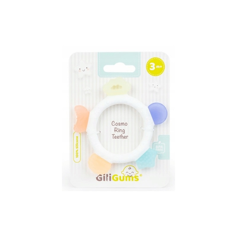 Praktyczny gryzak posiada 5 ramion, a każde z nich ma kształt innego, kosmicznego symbolu. Poszczególne kształty różnią się też kolorem i fakturą, przez co nie tylko zaciekawią maluszka, ale też przyniosą ulgę obolałym dziąsłom. Gryzak wykonany jest w całości z bezpiecznego silikonu, jest łatwy w czyszczenia.