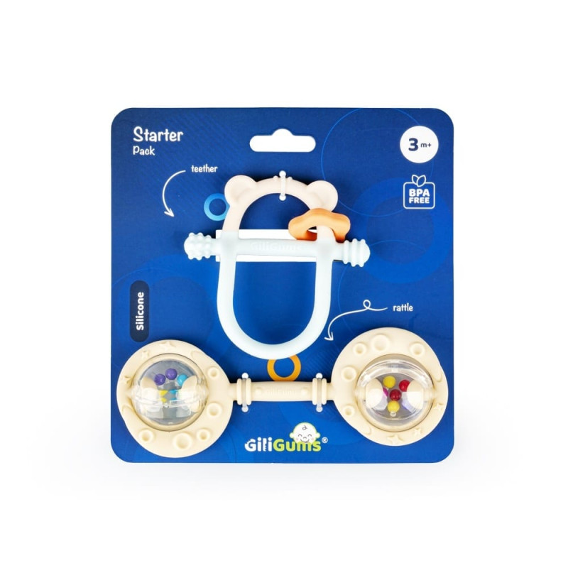 Pierwszy zestaw dla maluszka składa się z dwóch praktycznych zabawek: gryzaka miś podwójną grzechotkę w kolorze beżowym. Zabawki posiadają wypustki, które podczas gryzienia będą delikatnie masować dziąsła bobasa, przynosząc mu tym samym ulgę w ząbkowaniu. Kształt gryzaka i grzechotki ułatwia małym rączkom chwytanie zabawek. Zestaw sprawdzi się świetnie w charakterze prezentu.