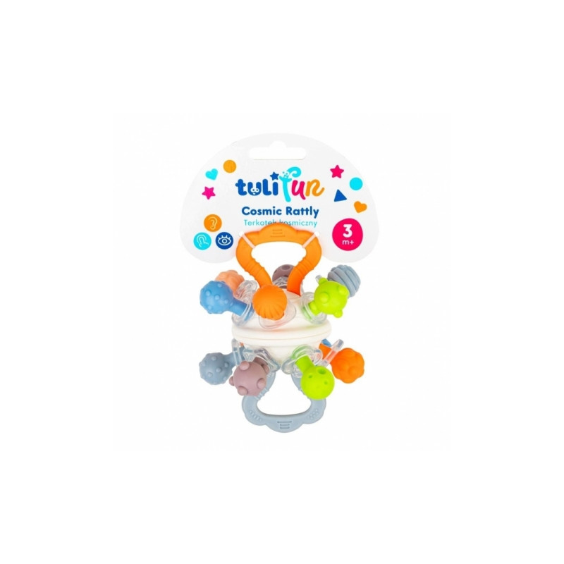 Ćwiczenie nadgarstków i ulga dla dziąsełek! Kolorowa zabaweczka posiada uchwyty z wypustkami, a po przekręceniu jej połówek w kierunkach odwrotnych względem siebie, wydaje zabawny dźwięk terkotania. Zarówno uchwyty, jak i fakturowane kuleczki sprawdzą się świetnie w roli gryzaka, co czyni terkotka nie tylko wesołą zabawką, ale też przydatnym akcesorium dla każdego bobasa.
