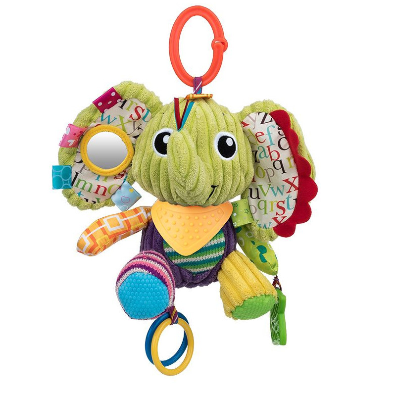 Zawieszka Słoń Elvis firmy Dumel Discovery. Mięciutka i kolorowa zawieszka, która w uchu ukryte ma lusterko. Dziecko podczas zabawy może odkrywać mnóstwo niespodzianek. Gryzaczki, kółka i kolorowe tasiemki to jedynie niektóre atrakcje. Wiek 3 miesiące+