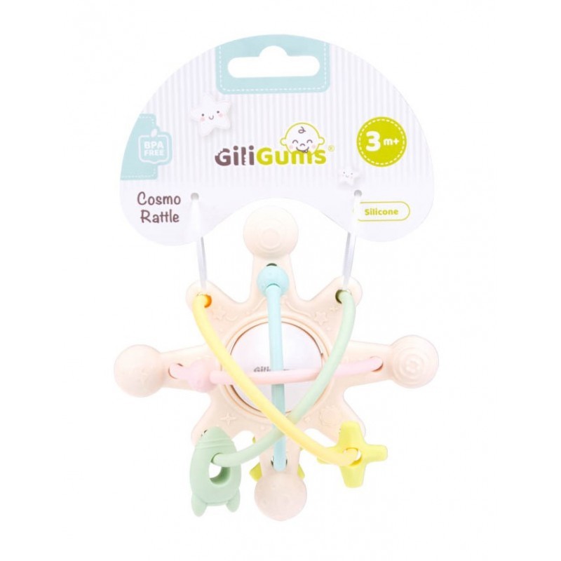 Zabawka łączy w sobie walory grzechotki i gryzaka! W centralnym punkcie znajduje się grzechoczące kula, a naokoło niej rozpościerają się miękkie, elastyczne linki, po których przesuwać możemy ruchome elementy. Kształt zabawki i jej wymiary są idealnie dostosowane do małych rączek. Grzechotkę zdobią wypustki o zróżnicowanych kształtach, które przyniosą ulgę ząbkującemu dziecku.
