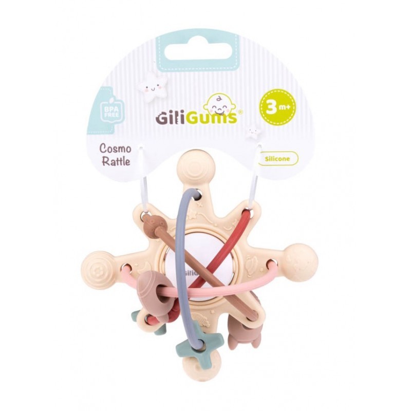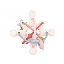 Zabawka łączy w sobie walory grzechotki i gryzaka! W centralnym punkcie znajduje się grzechoczące kula, a naokoło niej rozpościerają się miękkie, elastyczne linki, po których przesuwać możemy ruchome elementy. Kształt zabawki i jej wymiary są idealnie dostosowane do małych rączek. Grzechotkę zdobią wypustki o zróżnicowanych kształtach, które przyniosą ulgę ząbkującemu dziecku.