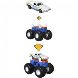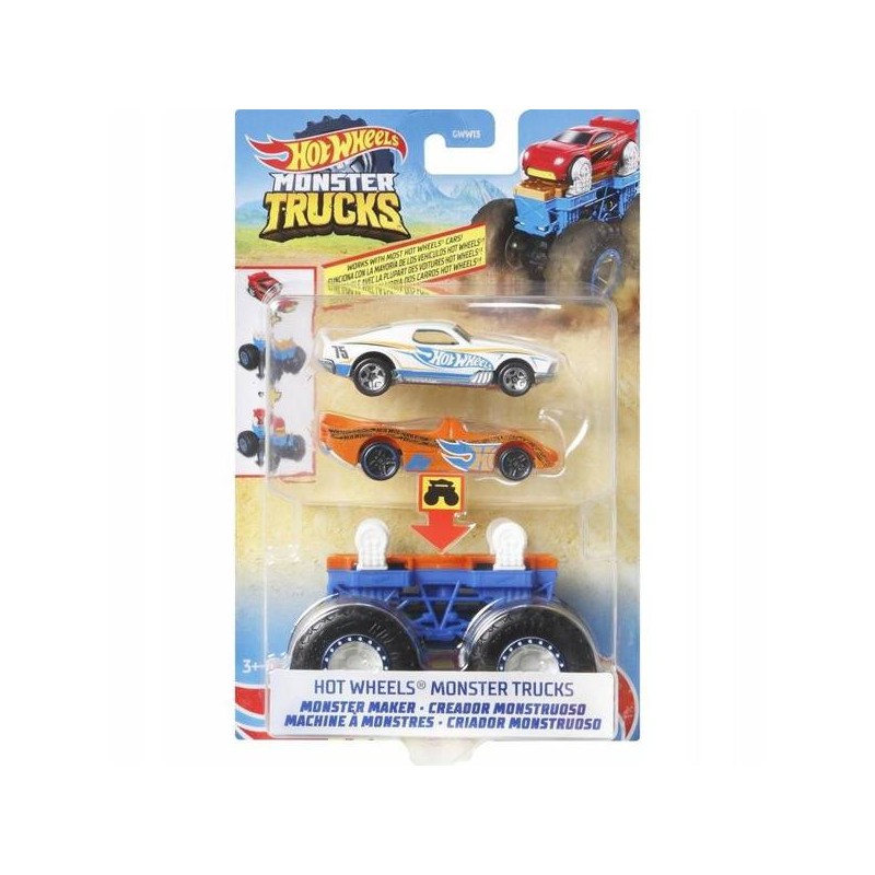 Przekształć swoje samochodziki Hot Wheels w pojazdy Monster Trucks za pomocą rewolucyjnego systemu Monster Maker! Łącz podwozia Monster Trucks z samochodzikami Hot Wheels w skali 1:64 i odkryj zupełnie nowy wymiar zabawy. Do wyboru jest kilka różnych kolorów podwozia, a każdy zestaw ma też 2 samochodziki Hot Wheels, co pozwala na wypróbowanie różnych kombinacji. Do zestawów pasuje większość autek Hot Wheels, więc możesz wykorzystać swoją kolekcję, by tworzyć nowe wersje ulubionych modeli. Rozbuduj swój świat Hot Wheels akcentami w stylu Monster Trucks i oddaj się nieskończonej kreatywnej zabawie! W zestawie z każdym podwoziem są 2 samochodziki Hot Wheels o wyjątkowym wyglądzie.