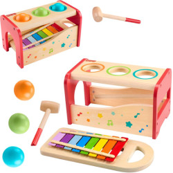 Ten dwufunkcyjny zestaw, wykonany z drewna z certyfikatem FSC, zapewnia mnóstwo zabawy, rozwijając małą motorykę i zmysły dziecka. Dzięki ławce do uderzania kulek i ksylofonowi, maluchy mogą tworzyć własne melodie i uczyć się zasad przyczyny i skutku. Zabawka 2w1 to połączenie ksylofonu i przebijaka, wykonana z naturalnego drewna i utrzymana w stonowanych, neutralnych barwach, które doskonale komponują się z eleganckim, minimalistycznym designem.