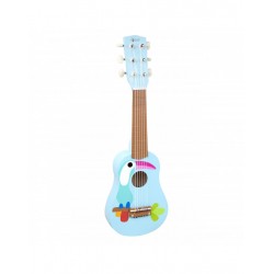 Drewniana gitara, piękny instrument muzyczny dla dzieci w pastelowym błękitnym kolorze ze wzorem tukana. Instrument pozwala opanować pierwsze akordy. Doskonały produkt do przetestowania pierwszych, dziecięcych fascynacji światem muzyki. Świetnie imituje prawdziwy instrument. Super zabawa poprzez naukę.