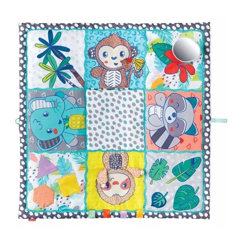 Ta wyjątkowo duża mata do ćwiczeń tworzy bezpieczne, miękkie miejsce do zabawy dla dziecka. Teksturowane tkaniny i szeleszczące elementy zapewniają wczesną integrację sensoryczną, a kontrastowe kolory przyciągają uwagę dziecka i zachęcają do zabawy. Mata oferuje dużą przestrzeń do raczkowania, siedzenia oraz zabawy na brzuszku. Od udawanego karmienia małpy po odkrywanie teksturowanych kształtów, szeleszczących dźwięków, kolorowych wstążek i gigantycznego lusterka, dziecko będzie zachwycone interaktywnymi zajęciami sensorycznymi. Lusterko i banany można przemieszczać w różne miejsca maty. Łapki leniwca są ruchome i można się nimi bawić w a kuku. Jedno ramię zwierzątka szeleści. Mata łatwo składa się do wymiarów 40 x 60 cm (do przechowywania w domu lub zabrania ze sobą na przygodę na świeżym powietrzu). Łatwa do czyszczenia: można prać w pralce.