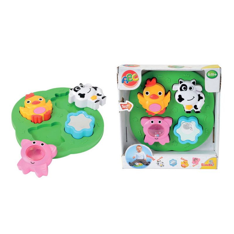Puzzle Farma z grzechotką firmy Simba. Ułóż puzzle w ramce, która posiada wgłębienia pomagające dopasować zwierzątka. Każdy element kryje inna niespodziankę, kwiatek ma lusterko, w ryjku świnki znajdują się kolorowe, grzechoczące koraliki. Natomiast krówka i kurczaczek wydając zabawne dźwięki. Wiek 6 miesięcy+
