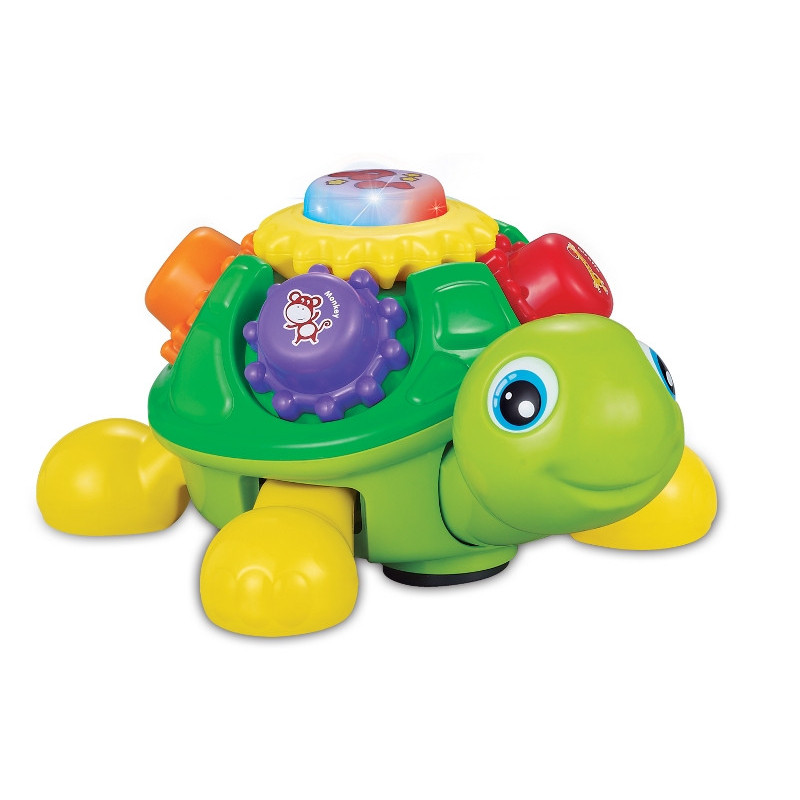 Wesoły żółw firmy Artyk. Żółwik wyposażony w efekty dźwiękowe oraz 6 melodii. Dodatkowo porusza się rotacyjnie we wszystkich kierunkach a kolorowe pokrętła zachęcą dziecko do zabawy. Wykonany z wysokiej jakości materiałów. Długość 20 cm Wiek 18 miesięcy+