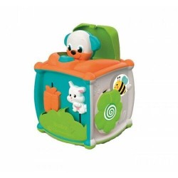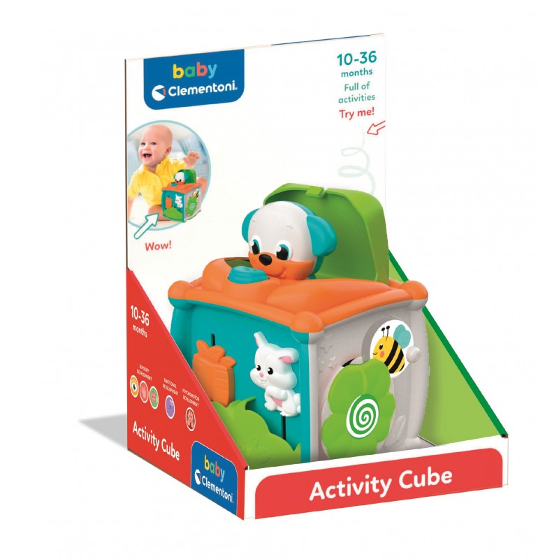 Kostka aktywności z wieloma czynnościami mechanicznymi. Zawiera aktywność z efektem Wow, którą można aktywować za pomocą przycisków, rolek, kół zębatych, itp. Zawiera też grzechotki i efekty dźwiękowe.
