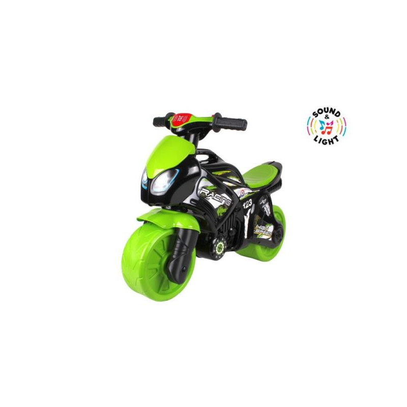 Pojazd z ruchomą kierownicą i obrotowymi kołami. Jej rączki są wykonane z gumy. Naklejki znajdujące się na zabawce zwiększają jej realizm (np. imitują światła). Szerokie koła zapewniają stabilność jeździka i gwarantują zachowanie równowagi dziecka podczas użytkowania. Motor został wykonany z wytrzymałego tworzywa, dzięki czemu przez długi czas będzie odgrywał swoją rolę.