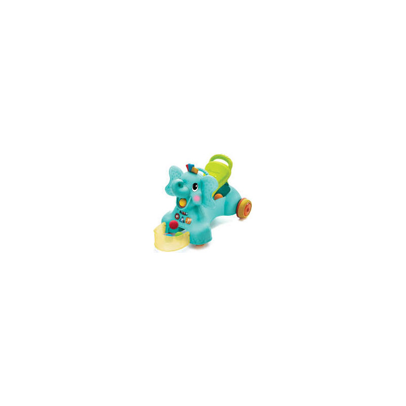 Jeździk słoń gra 3 wesołe melodie oraz wydaje 20 efektów dźwiękowych i świetlnych. Posiada miękkie uszy z wypustkami do chwytania i gryzienia. Prędkość kół można regulować.