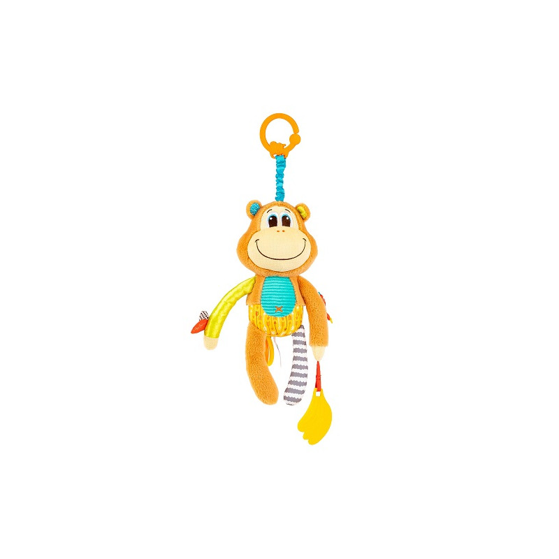 Wesoły małpiszonek rozbawi bobasa, a gdy przyjdzie pora drzemki, zagra do snu uroczą kołysankę. Zabawkę zdobi miękki gryzaczek w kształcie kiści bananów, który z pewnością przyda się każdemu ząbkującemu maluchowi. Małpka uszyta została z materiałów o zróżnicowanych kolorach, wzorach i fakturach, dzięki czemu stymuluje zmysły dziecka, inspirując go do sensorycznego odkrywania świata. Aby uruchomić pozytywkę, wystarczy pociągnąć kółeczka, znajdujące się w miejscu małpiego ogonka. Zabawka wyposażona jest w praktyczną zawieszkę, dzięki której przymocujesz małpkę w dowolnym miejscu, aby wszędzie mogła towarzyszyć dzidziusiowi.