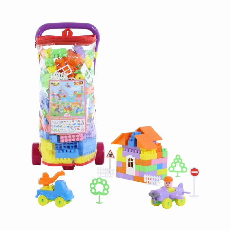 Taczka "Caddie" + klocki firmy Polesie. Klocki dla dzieci wykonane z wysokiej jakości materiałów w żywej kolorystyce. Zestaw zawiera 263 elementów.