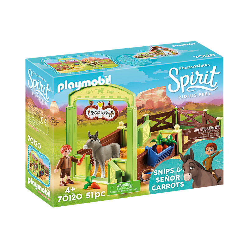 PLAYMOBIL to synonim kreatywnej zabawy - wcielania się w rolę; to jakość i bezpieczeństwo na najwyższym poziomie. Klocki te niezmiennie zalicza się do ulubionych zabawek dzieci. Zaufanie rodziców do marki bazuje także na wiedzy o wysokiej jakości produktu "Made in Europa". Poszczególne elementy zestawów Playmobil można łączyć z innymi, tworząc nowe i niepowtarzalne historie. PLAYMOBIL Spirit- Riding Free Boks stajenny Snips i Pan Marchewka. Wiek 4+