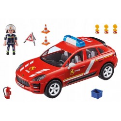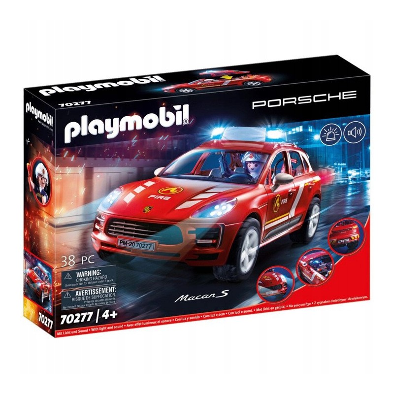 Zestaw zawiera samochód strażacki marki Porsche Macan S z super efektem świetlnym w środku i na zewnątrz pojazdu, a także efekty dźwiękowe. Zdejmowany dach ułatwia zabawę we wnętrzu pojazdu. W samochodzie są miejsca dla 4 figurek Playmobil. Akcesoria: 1 lizak, 1 walkie-talkie, 1 latarka, 1 gaśnica, 2 pachołki, 1 trójkątny znak. 38 elementów.