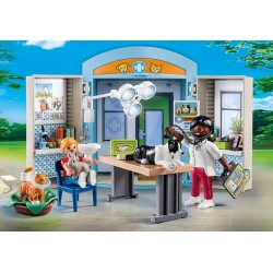 Zestaw zawiera 2 figurki, kota, psa, królika, przenośny gabinet weterynaryjny oraz akcesoria tematyczne. Gabinet posiada pokój przyjęć w którym znajduje się stół do badań, lampę lekarską, mikroskop oraz akcesoria medyczne. Wszystkie części można schować do środka a gabinet zamknąć i zamienić w małą walizkę. Dzięki temu rozwiązaniu ten zestaw jest łatwy w transporcie i można go zabrać wszędzie. 59 el.