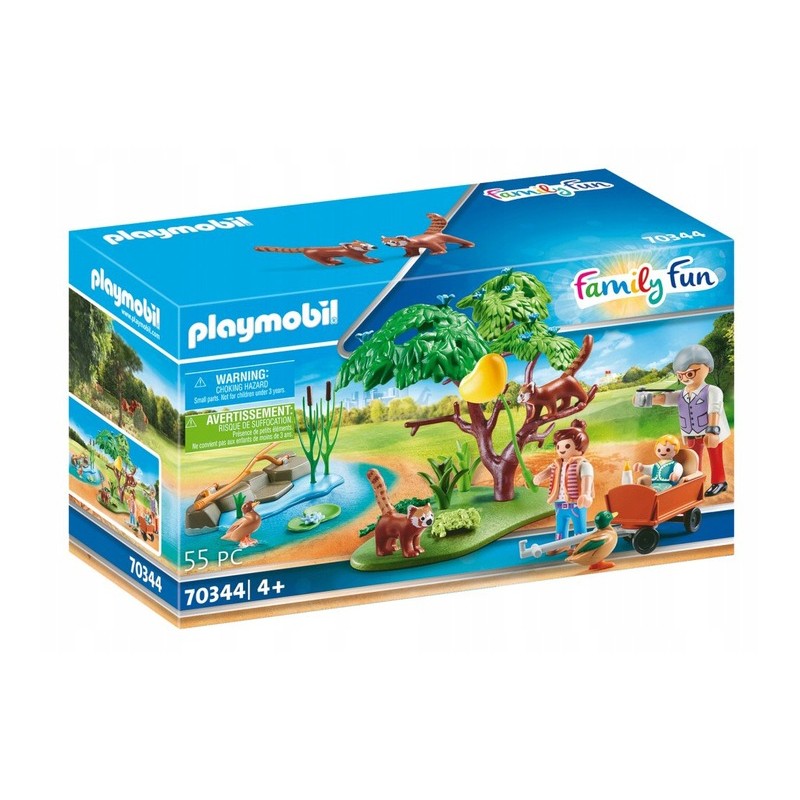 Zestaw z pandami 55 elementów zawiera: figurki 1 mężczyzna, 1 kobieta, 1 dziecko, 2 pandki rude, 2 kaczki, 1 wózek do ciągnięcia z fotelikiem dla dziecka, 1 element ogrodzenia z wodą i wodnymi roślinami, 1 trawnik z drzewem i roślinami, 1 torba, 1 aparat fotograficzny na sznurku, 1 balon, 1 butelka do picia dla niemowlaka, 1 bidon, 1 zegarek na rękę