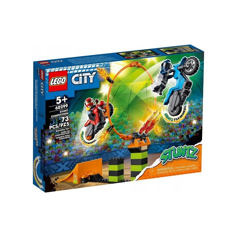 W komplecie 73 elementy, w tym dwa motocykle napędzane kołem zamachowym do wykonywania wspaniałych akrobacji na tylnym kole oraz w powietrzu, a także regulowana rampa do skoków i tor z płonącą obręczą. Do tego minifigurki motocyklisty i Duke’a DeTaina z serialu telewizyjnego Lego city i już można ruszać do spektakularnej kaskaderskiej akcji. Konkurs kaskaderski ma ok. 24 cm wysokości, 22 cm szerokości i 11 cm głębokości.