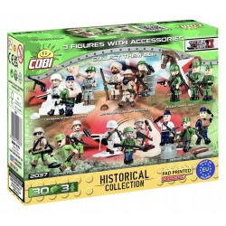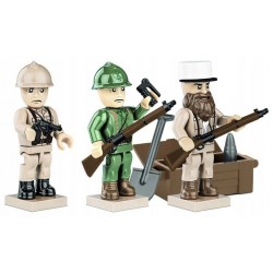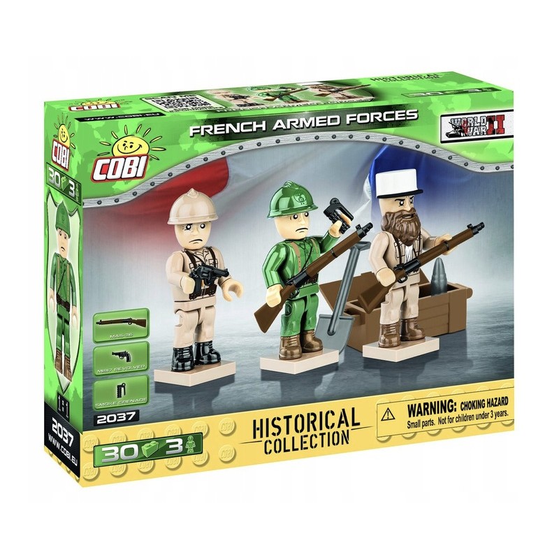 30 - elementowy zestaw figurek w całości dedykowany armii francuskiej. Znajdziemy tu żołnierza w mundurze tropikalnym wyposażonego w pistolet osobisty, żołnierza piechoty z 1940 roku oraz żołnierza Legii Cudzoziemskiej wyposażonych w dwukolorowy karabin MAS-36. Broń nie jest malowana! To dwukolorowy wtrysk z ABSu wykonany przy użyciu najnowszej zaawansowanej technologii! Legionista dodatkowo jest wyposażony w charakterystyczną czapkę kepi, która jest nowym akcesorium w ofercie COBI. Wszystkie figurki otrzymały nowy, nieco wyższy wzór nóżek ze wpinanymi bucikami. Dodatkowo do zestawu zostały dołączone praktyczne podstawki pod figurki oraz skrzynka z akcesoriami. Zabawa klockami rozwija wyobraźnię, sprawność manualną. Wiek 5+.