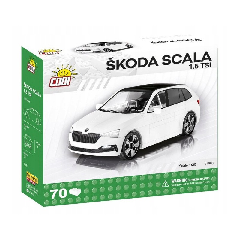 Model z klocków konstrukcyjnych Cobi wiernie oddaje charakterystyczne kształty oryginalnego samochodu, Skoda Scala 1.5 TSI. Auto w wersji Emotion otrzymało biały lakier oraz czarny panoramiczny dach. Dzięki 70 elementom możliwe są drobne modyfikacje i przeróbki pojazdu. Na klockach znajdują się trwałe nadruki, które nie ścierają się nawet w trakcie intensywnego użytkowania. Obracające się koła wyposażone w opony idealnie nadają się do poruszania modelem w trakcie zabawy.