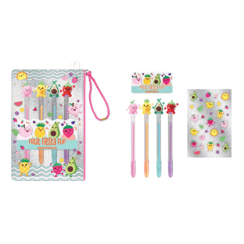 Zestaw zawiera - 4 żelowe długopisy zapachowe z zabawnymi ozdobnymi końcówkami oraz klejące mini - karteczki w 4 różnych kształtach oraz arkusz naklejek. Zapakowane w przezroczystą saszetkę zapinaną na zamek, dodatkowo sznureczek do wygodnego przenoszenia.