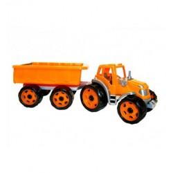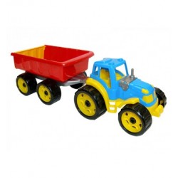 Zabawkowy traktor z przyczepą. Produkt wykonany z mocnego, wysokiej jakości tworzywa sztucznego, bezwonny i bez ostrych krawędzi.