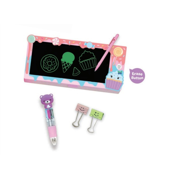 Prosty tablet do rysowania, który umożliwia tworzenie kolorowych obrazków i napisów za pomocą dołączonego rysika. Popularny jako zabawka edukacyjna lub do kreatywnej zabawy. Grafiki powstają na czarnym ekranie, a po naciśnięciu przycisku ekran się czyści, gotowy do ponownej zabawy. Po podniesieniu ekranu otworzy się pudełeczko na drobiazgi.