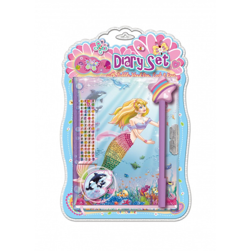 W zestawie znajduje się ozdobny długopis, naklejka 3D, cekiny samoprzylepne do ozdabiania oraz 2 kluczyki do zamka.