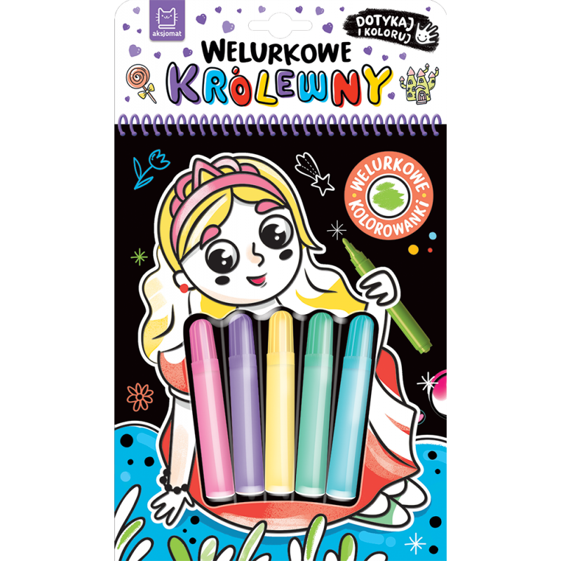 Kolorowanka sensoryczna z dołączonymi pisakami. Tło obrazków pokrywa czarny welur, który podkreśla głębię kolorów, zapewnia wrażenia sensoryczne i ogranicza wychodzenie poza linię. Mali fani i fanki królewien przekonają się, że przedstawicielki królewskiego rodu mają naprawdę ciekawe zajęcia. Zapraszamy na spotkanie z wielbicielką motyli, uczestniczką przyjęcia urodzinowego, baletnicą, zaklinaczką małych smoków, fanką leśnych przejażdżek, strojnisią, skrzypaczką i pisarką. Dzieci nie tylko pokolorują 8 uroczych rysunków. Rozwiążą również zagadki powiązane z tematyką ilustracji. A dzięki perforacji pokolorowaną pracę mogą oderwać, włożyć do ramki i podarować w prezencie lub ozdobić nią pokój. Książeczki z serii „Welurkowe kolorowanki” wspierają rozwój sensoryczny dziecka i naukę pisania, pomagają ćwiczyć motorykę małą i koordynację ręka-oko, rozwijają wyobraźnię, uczą staranności i cierpliwości. Dotykaj i koloruj – poznaj świat welurkowych królewien.