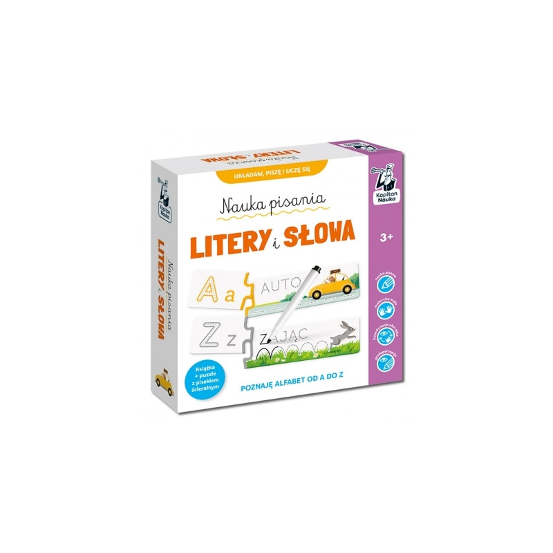 Zestaw pozwala poznać 24 podstawowe litery alfabetu. Książka z różnorodnymi zadaniami zachęca do pierwszych prób pisania, a dołączone do zestawu puzzle pozwalają utrwalić nowo zdobyte umiejętności. W czasie zabawy dziecko łączy elementy z literami i odpowiadającymi im słowami oraz rozwija sprawność grafomotoryczną, poprawiając pisakiem szlaczki, litery i słowa. Ścieralna powierzchnia puzzli umożliwia wielokrotne próby i doskonalenie pisania. Barwne ilustracje z wesołymi postaciami ułatwiają zapamiętywanie liter.