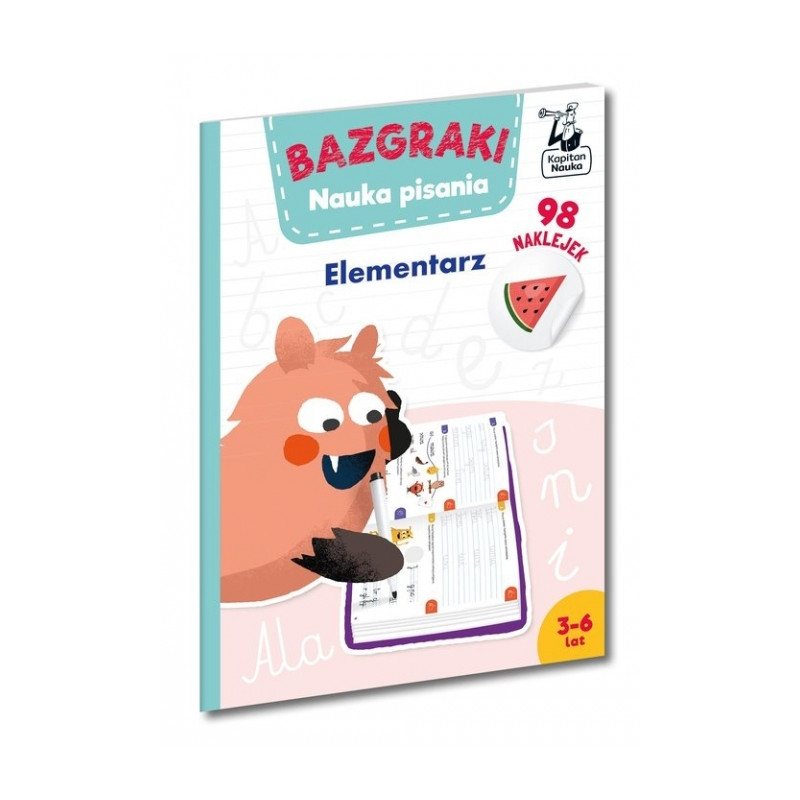 Bazgraki. Nauka pisania. Elementarz (3–6 lat) to książka z ćwiczeniami dla przedszkolaków, które uczą się pisać. Dzięki różnorodnym zabawom grafomotorycznym ćwiczą rozpoznawanie wszystkich liter polskiego alfabetu i właściwy kierunek ich kreślenia, a łączenie poszczególnych liter trenują w liniaturze, by przygotować się do pisania sylab, wyrazów i całych zdań.