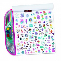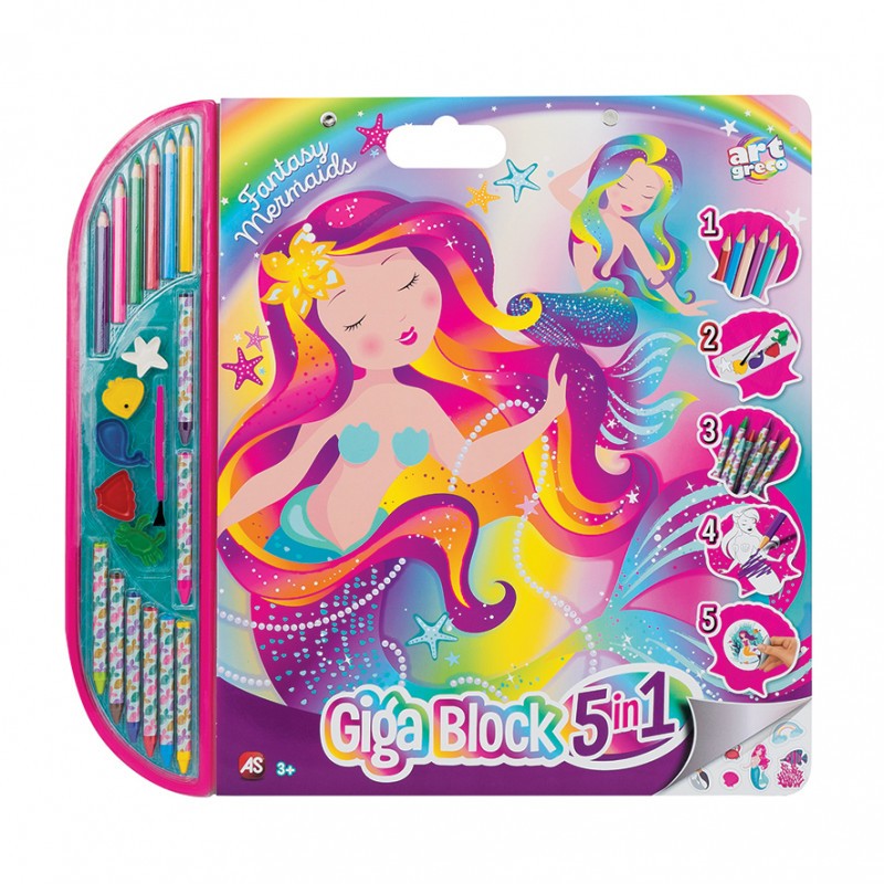 Dużą kolorowanka, która zachwyci każdego miłośnika syrenek i morskich stworzeń. Zawiera, aż 30 obrazków do kolorowania. Są one duże i bardzo przejrzyste. W zestawie znajduje się również 6 kredek ołówkowych, 8 kredek świecowych, 5 farbek akwarelowych z pędzelkiem oraz cały arkusz naklejek. Na końcu znajdują się również czyste strony, aby mały artysta, mógł stworzyć swoje własne dzieło od podstaw.