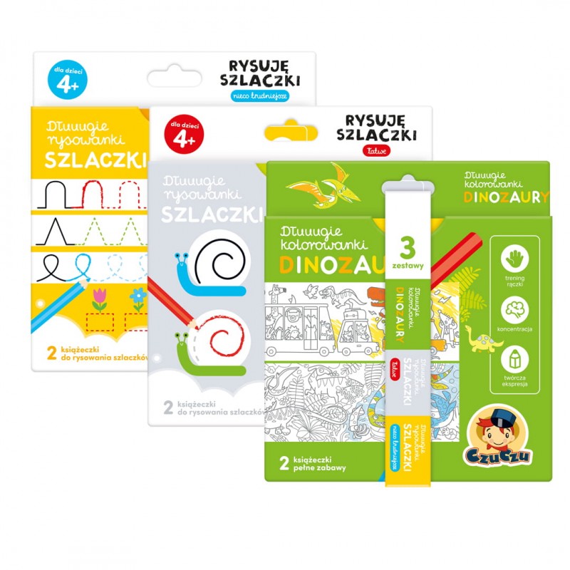 Zestaw zawiera 3 tytuły: Dłuuugie rysowanki Szlaczki Łatwe, Dłuuugie rysowanki Szlaczki Nieco trudniejsze oraz Dłuuugie kolorowanki Dinozaury.