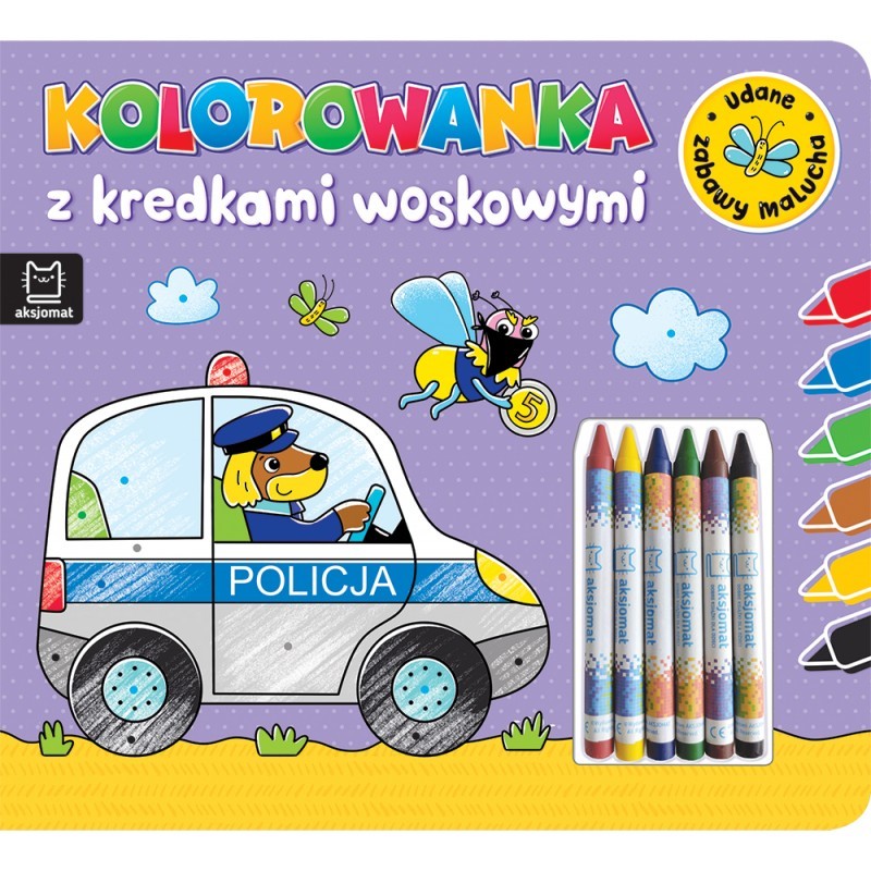 Kolorowanka z kredkami woskowymi to najlepsza zabawa edukacyjna dla maluchów. Dołączone miękkie kredki woskowe ułatwiają dzieciom kolorowanie. Maluchy mogą korzystać z podpowiedzi w postaci barwnych kropek lub dowolnie dobierać kolory. Ciekawa tematyka obrazków i wesołe wierszyki są dodatkowymi zaletami książki.