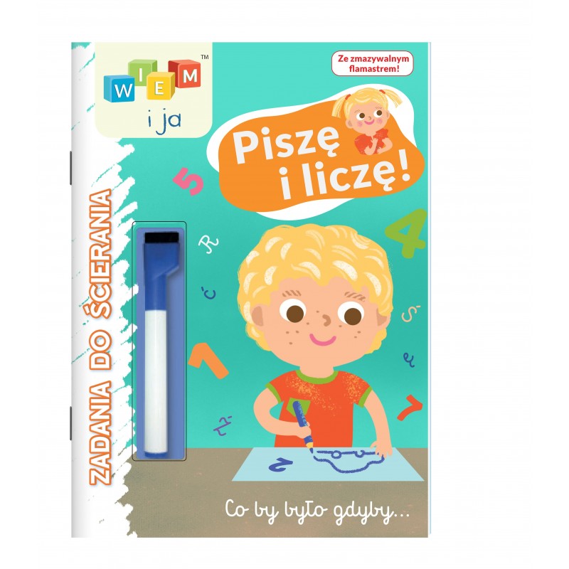 Książeczka "Wiem i ja" zawiera różne zadania, które można rozwiązywać za pomocą flamastra, który jest dołączony do zestawu. Dzięki laminowanym stronom książki, można powtarzać ćwiczenia wielokrotnie.