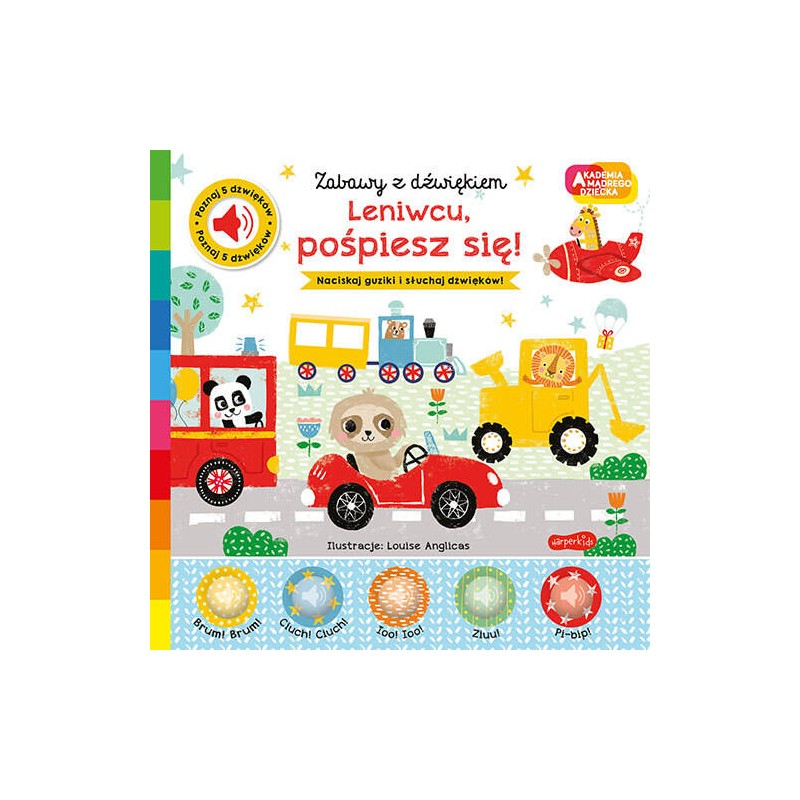 Ta książeczka to urocza historia o perypetiach leniwca-kierowcy. Podczas lektury maluchy wciskają kolorowe guziczki i poznają różne dźwięki ulicy.