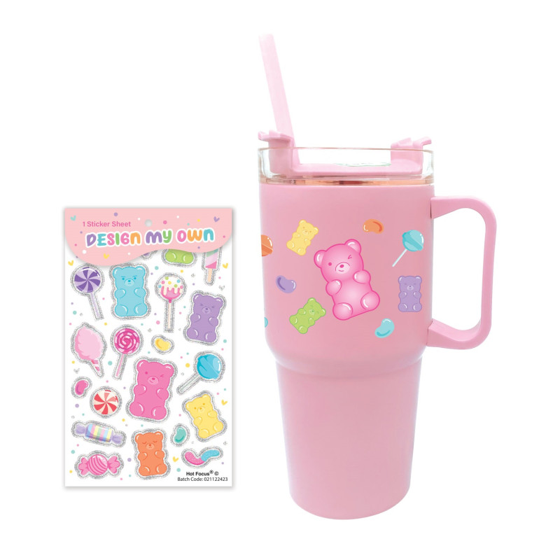 Super wielki kubek z uchem, wykonany z metalu dla dodatkowej izolacji temperatury napoju, zaprojektowany jest zgodnie z najnowszymi trendami najpopularniejszych kubków na świecie! Posiada zamykaną nakrętkę z dodatkową przesuwaną zatyczką, w której znajduje się otwór na słomkę. Zestaw posiada również, arkusz holograficznych naklejek, którymi można dodatkowo pięknie ozdobić swój kubek.