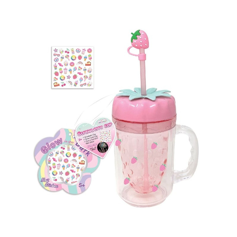 Kubek z uchem, wykonany z grubego plastiku z podwójną ścianką dla dodatkowej ochrony, zakręcany ozdobną nakrętką. Do kubka dołączona jest wielorazowa słomka oraz arkusz naklejek świecących w ciemności, którymi można dodatkowo ozdobić i wyróżnić swój kubek. Słomkę można zamknąć silikonową zatyczką dla większej higieny. Wewnętrzna ścianka kubka jest w kształcie truskawki.