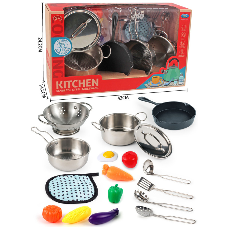 Zestaw 17 elementów - 2 garnki, patelnia, pokrywki, durszlak, łyżki do gotowania oraz plastikowe warzywa i podkładka z materiału. Wymiary opakowania: 24.2 x 14.2 x 42 cm
