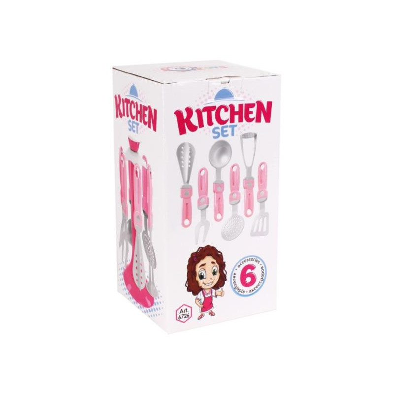 Zestaw dla wszystkich dzieci, które uwielbiają gotować i sprzątać po swojej pracy. Zabawka przyciąga uwagę ciekawym wyposażeniem i ładną kolorystyką ma wszystko, czego potrzeba do odgrywania tej roli. Elementy zestawu doskonale imitują prawdziwe akcesoria kuchenne. Kompaktowy rozmiar zestawu daje możliwość zabawy w domu bądź na podwórku. Wszystkie narzędzia posiadają wygodne rączki z małym otworem na końcu. Dzięki temu możemy założyć akcesoria na dostępny w komplecie stojak o stabilnej podstawie. Wszystkie elementy zostały wykonane z wytrzymałego tworzywa. Nie są łamliwe, nawet gdy zostaną wzięte przez przypadek do buzi.
