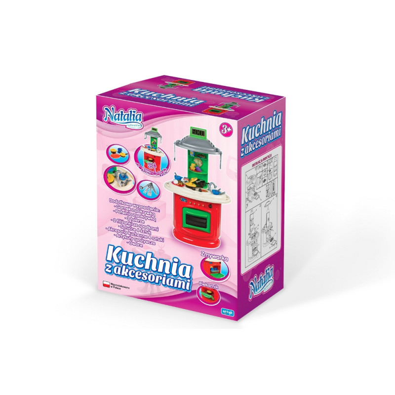 Kuchnia Natalia firmy Artyk.Kuchnia ze zmywarką i piekarnikiem, okapem i palnikami, zlewozmywakiem oraz blatem. Zestaw zawiera wiele akcesoriów kuchennych zarówno naczynia jak i imitację składników spożywczych. Wymiary 100 x 62 x 42 cmWiek 3+