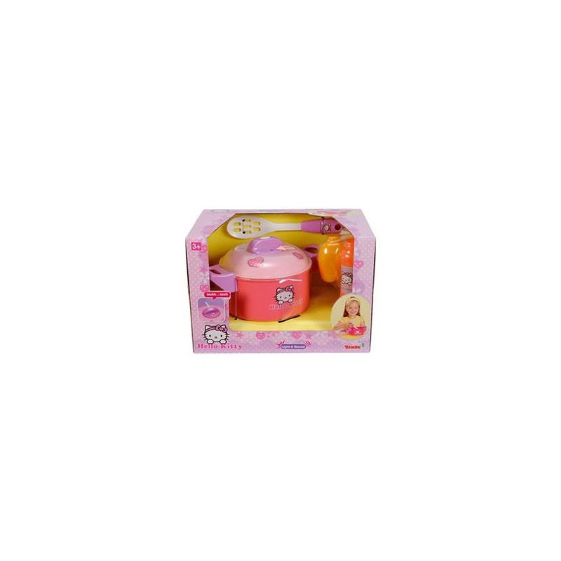 Naczynia Hello Kitty firmy Simba.Zestaw idealny dla każdego małego szefa kuchni. Składa się z garnka, która wydaje dźwięki jak prawdziwy, łyżka do mieszania, kukurydza oraz dwie buteleczki na przyprawy. Wystarczy, że naciśniesz guziczek umieszczony na pokrywce a usłyszysz jak kukurydza się gotuje. Do pełnego działania wymagane są 3 baterie R44 (baterie testowe załączone w zestawie).Wiek 3+
