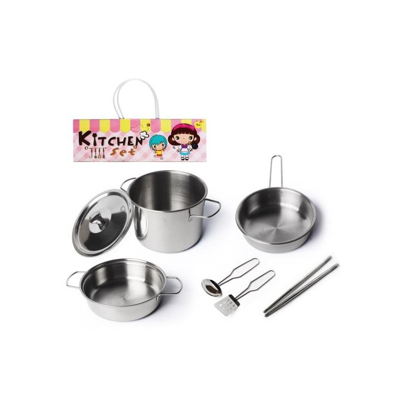 Zestaw obowiązkowy w każdej dziecięcej kuchni. Uniwersalny, metaliczny kolor pozwala bawić się nim zarówno przez dziewczynki jak i chłopców. Idealny do zabawy w dom, a nawet w restaurację. W zestawie znajduje się 8 elementów: 2 garnki, pokrywka, patelnia, chochelki, łopatki kuchennej oraz 2 pałeczki. Wszystkie wykonane z mocnego, trwałego, odpornego na uszkodzenia materiału.