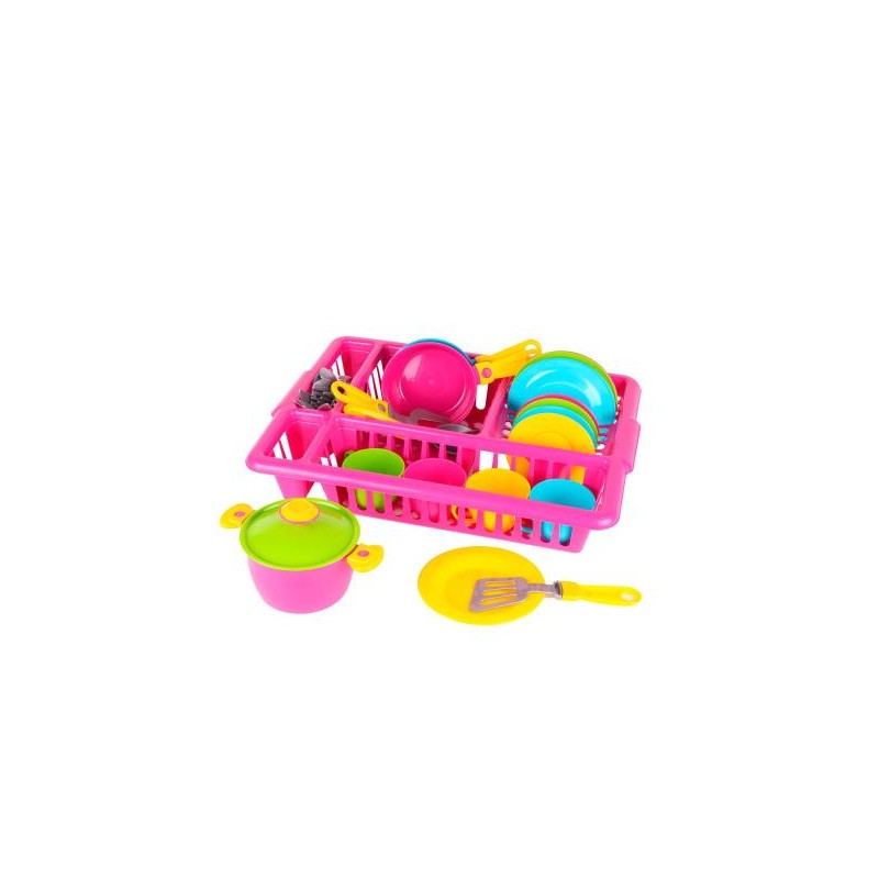 Zawartość: suszarki do naczyń, garnek z pokrywką, rondelek, patelnia, 4 duże talerze, 4 filiżanki, 4 małe talerzyki, przybory kuchenne, sztućce. Cechy: wszystkie elementy zestawu wykonane są z wytrzymałego i bezwonnego tworzywa sztucznego,