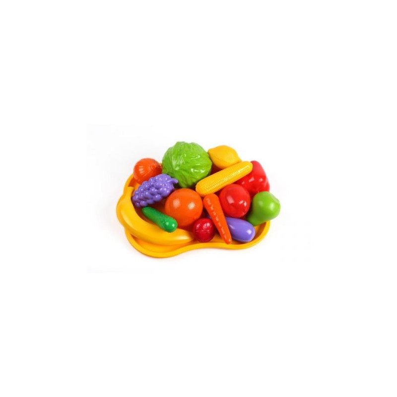 W zestawie znajdziemy następujące owoce i warzywa: winogrono, gruszka, pomarańcza, cytryna, truskawka, jabłko, pomidor, cebula, ziemniak, kukurydza, ogórek, marchewka, kapusta i bakłażan.