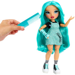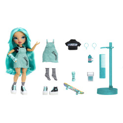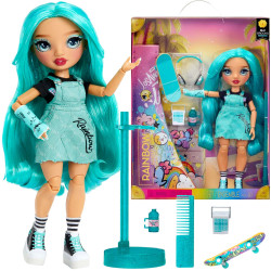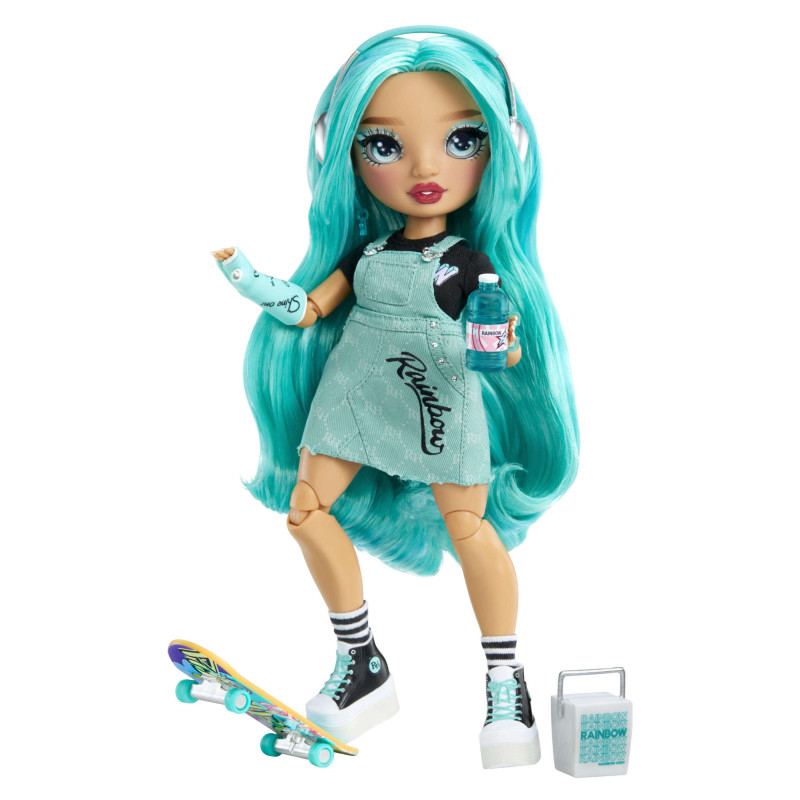Nowe lalki Reinbow High, różnią się wyglądem, stylem i zainteresowaniami, ale przyjaźnie pozostają w dobrych i złych chwilach! Modna lalka Blu Brooks (Morska) jest ubrana w sukienkę, czarną koszulkę i tenisówki. Taką stylizacją wyraża swój luźny styl i swobodne podejście do życia. Dziewczyna nosi gips, na którym podpisali się wszyscy jej znajomi, a z domu nie rusza się bez deskorolki i słuchawek. Każdy kolor tęczy jest piękny, zbierz wszystkie trzy modowe lalki z kolekcji New Friends. Unikalne akcesoria zainspirują cię do kreatywnej zabawy i wymyślania, pomysłowych opowieści.