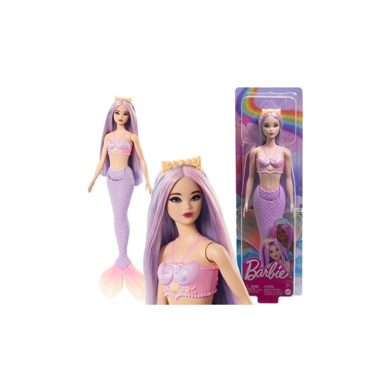 Super lalka Barbie do zabawy dla wszystkich wielbicieli i wielbicielek tych lalek. Syrenka z fioletowym ogonem i długimi niebiesko - różowymi włosami. Lalka ma ruchomą głowę, ramiona, a jej ogon zgina się w talii, dzięki czemu może siedzieć. Płetwa jest półprzezroczysta w pomarańczowym kolorze.
