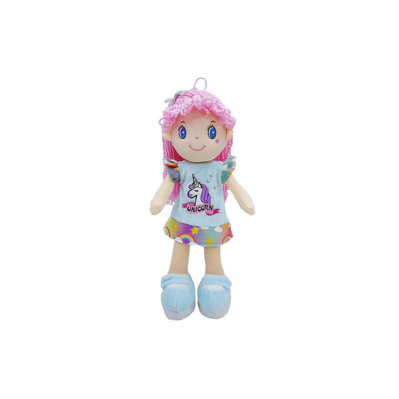 Lalka ma długie wełniane włosy w kolorze różowym , niebieskie wyszywane oczka i uśmiech na szmacianej buzi. Ubrana jest w kolorową, pluszową sukienkę z krótkim rękawkiem, z popiersiem jednorożca i napisem Unicorn, we włosy ma wpiętą srebrną kokardę. Lalka wykonana jest z dobrej jakości materiałów, starannie i precyzyjnie.