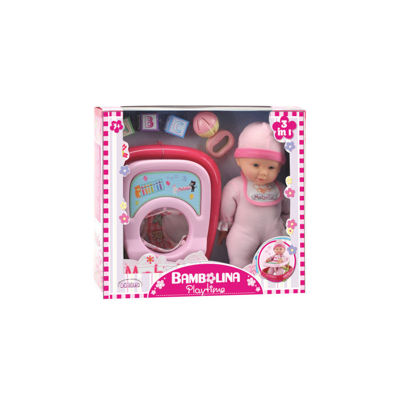 Lalka Bambolina zachwyci każdą dziewczynkę. Włóż ją do chodzika i weź na spacer, dzięki sznureczkowi przymocowanemu do chodzika . Zestaw zawiera lalkę w różowym ubranku, chodzik oraz zabawki.